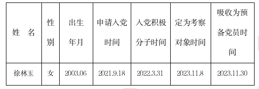 经支委会研究,拟定于2024 年12 月11日召开党员支部大会,对预备党员徐林玉转为中共正式党员进行讨论,望广大师生予以监督。如不符合转正条件,请在公示之日起七天内向本支部或上级党委举报,并提供必要的证据。反馈电话: 83803652 。