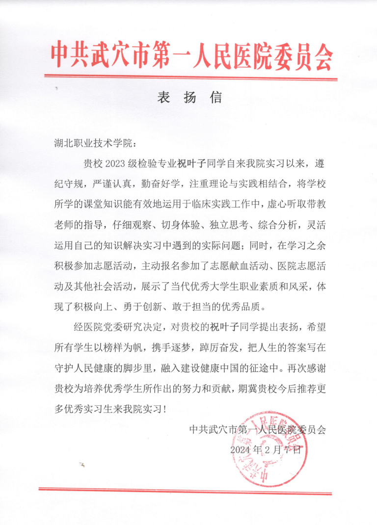 2024年2月8日,beat365实习合作单位武穴市第一人民医院发来喜讯,beat365亚洲体育官方网站2021级医学检验技术2班学生祝叶子在实习期间,责任心强、工作态度认真、积极进取、专业技能扎实,赢得领导、科室老师的一致好评,经医院党委研究决定,特向该生提出表扬。