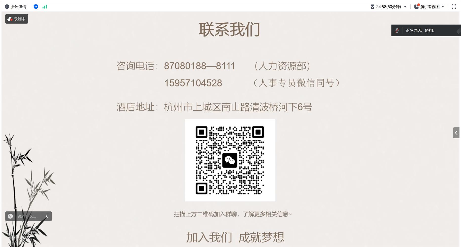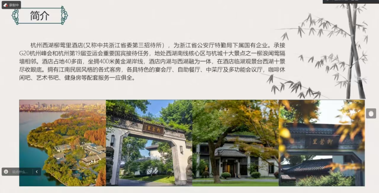 宣讲会上,杭州西湖柳莺里酒店企业HR向同学们展示了企业文化、岗位需求、发展前景、薪资待遇等招聘信息,与会同学也针对自己感兴趣的问题与企业进行线上交流沟通,主动了解用人单位的基本情况并表达自己的求职意向。