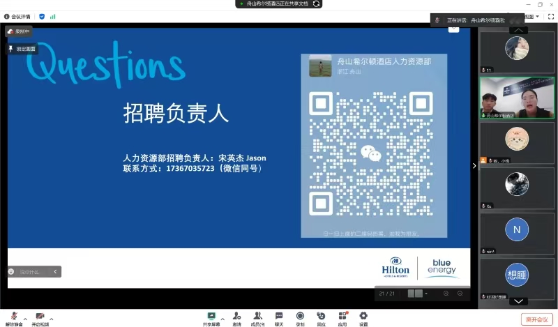 为了进一步拓展毕业生的就业渠道,加强与企业间的交流合作,今年会积极开展了线上访企拓岗活动。2024年11月18日中午,今年会官网成功举办了与舟山普陀东潮文化旅游发展有限公司海洲酒店分公司的线上招聘宣讲会,学院酒店管理与数字化运营专业的应届毕业生参加。