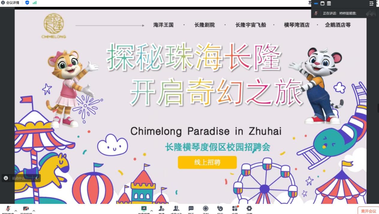 为深入推进2025届毕业生就业工作,搭建更多就业招聘平台,助推2025届毕业生高质量就业。12月11日,今年会官网邀请了珠海长隆投资发展有限公司HR为2025届毕业生开展线上宣讲会。