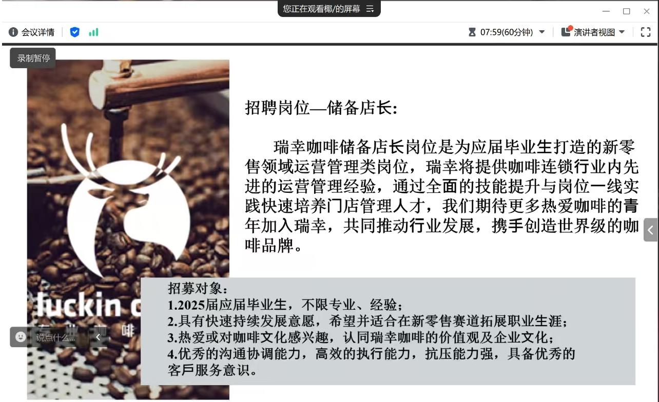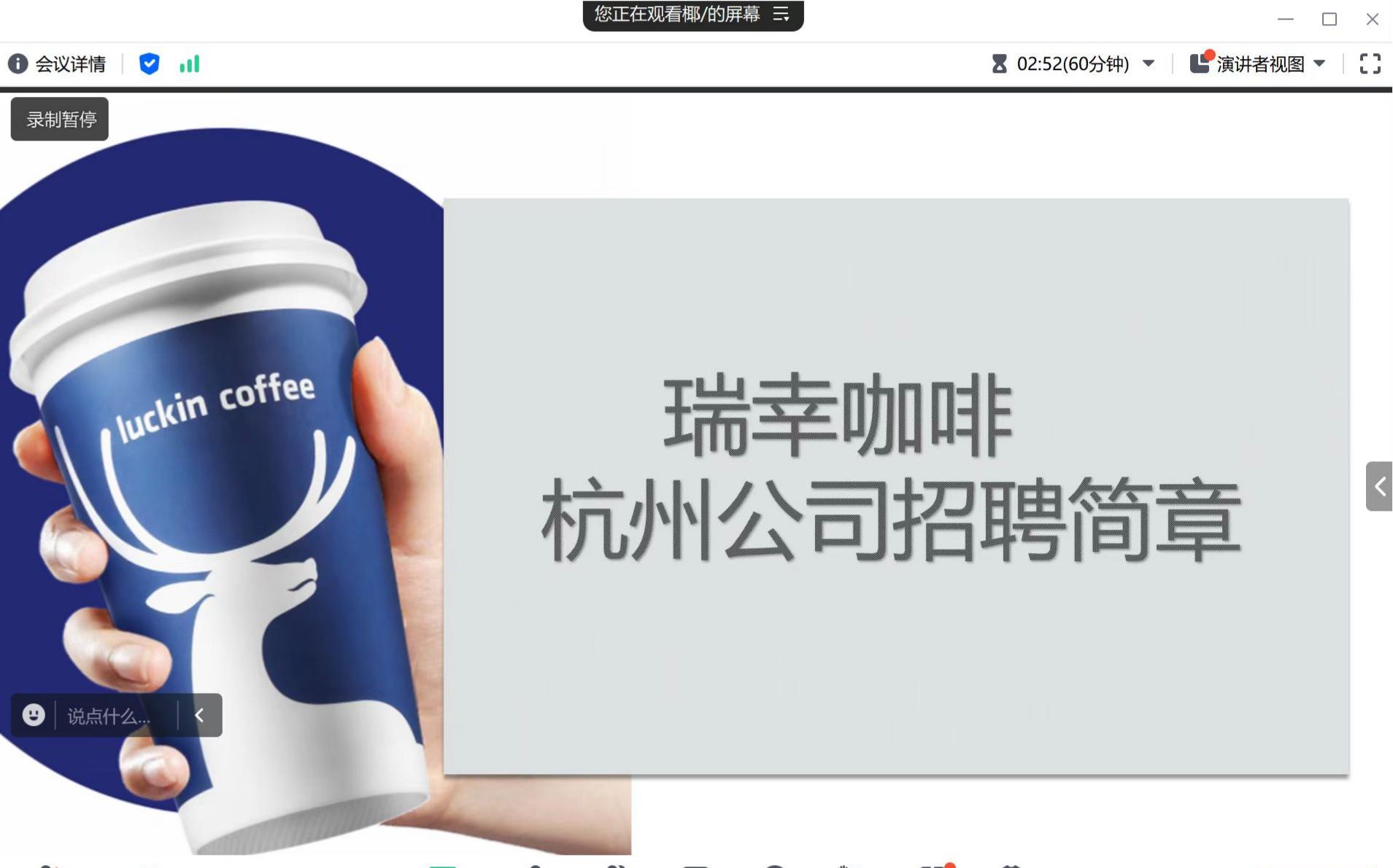 为搭建毕业生与用人单位沟通桥梁,实现人才供需精准对接,12月17日,今年会官网于腾讯会议组织开展瑞幸咖啡杭州公司宣讲会。