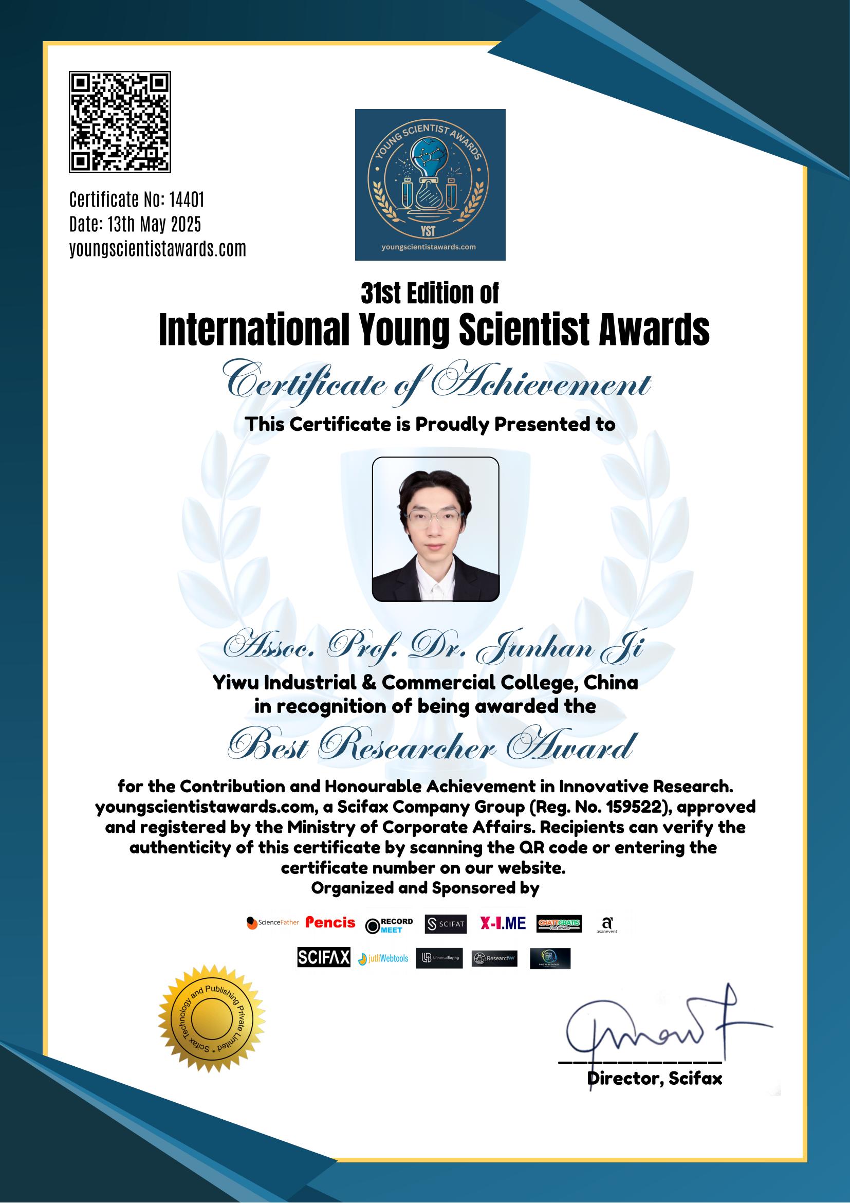 近日,今年会jinnianhuicom今年会官网青年教师季俊含博士因其在“角色冲突与中国社会工作者离职意向关系研究”方面取得的重要进展,荣获国际知名学术组织Science Father主办的第31届国际学术奖项(2025 31st Edition of International Academic Awards)“最佳研究者奖”(Best Researcher Award: For the Contribution and Honourable Achievement in Innovative Research)。