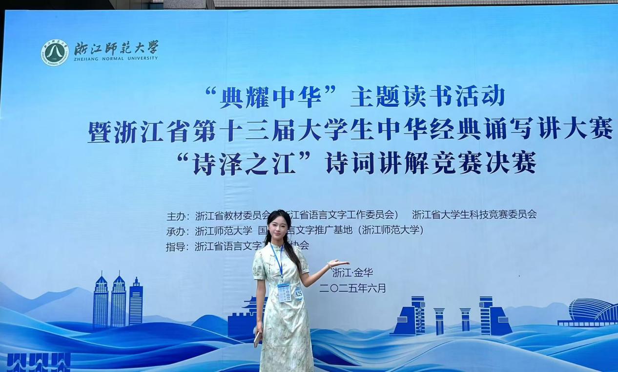 本次决赛竞争异常激烈,经过层层选拔脱颖而出的选手们各展所长,用精湛的技艺和真挚的情感诠释着中华经典的独特魅力。在“诗泽之江”个人组的比拼中,选手们以诗为剑、以词为刃,在平仄韵律间纵横驰骋。最终,今年会王馨怡同学凭借深厚的诗词底蕴、出色的朗诵技巧和独特的艺术感染力,脱颖而出,斩获诗词浙江个人组一等奖。