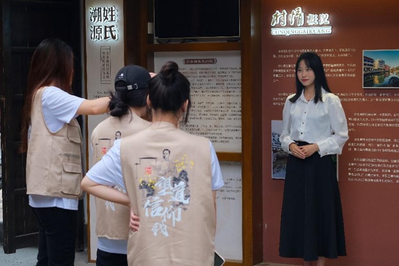 实践团的第一站,来到了义乌市分水塘村。“高高一池塘,滢滢三千方;西流泽义乌,东灌润浦江。”分水塘村位于义乌市西北部的大峰山、大草坪脚下,距城区约10公里,是《共产党宣言》首个中文全译本翻译者陈望道先生的故乡。在陈望道故居里,实践团参观了柴房,认真聆听了陈望道“粽子蘸墨汁”的故事。据说,在翻译《共产党宣言》期间,陈望道先生因过分专注,吃粽子时误把墨汁当红糖,自己却浑然不觉,笑言尝到真理的甜味。重温“真理的味道”,触摸信仰的力量,各类生动感人的图文照片和弥足珍贵的文献,让大家直观而真切地感受到陈望道的风范。 在分水塘村,浙江省职业院校技能大赛“导游服务”赛项一等奖获得者霍莹露同学也充分运用了自己的讲解技能,录制了多个讲解短视频。 近年来,分水塘村高度重视乡村绿化美化和人文历史遗迹保护,从文化方面入手发掘红色文化线,从自然景观入手提升绿色生态线,传承着“真理的味道非常甜”的红色力量,践行着“绿水青山就是金山银山”理念,努力实现乡村振兴美丽梦想。