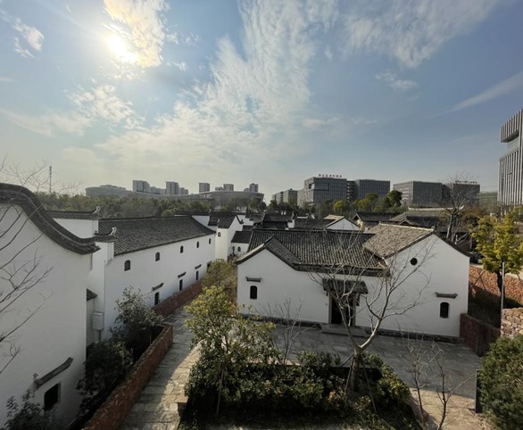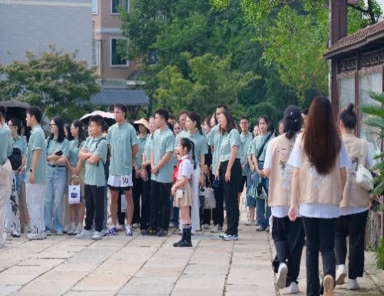 实践团的第三站,来到了有着“城市之中,尘世之外”之称的横塘公园,它位于“义乌发展经验”的总结地横塘村。该公园分“历史”“当代”“未来”三个区域,围绕义乌“莫名其妙、无中生有、点石成金”的精神布景,其中的旋转楼梯、交错长廊、仿古石亭、各式花海都让实践团体验到了原汁原味的乡村慢生活。 同学们了解到,水系是横塘公园的一大亮点。中国美术学院风景建筑设计研究总院利用香溪河道改造工程,将河水一路引至公园处,再利用高差通过公园内各条水系回流。同时,公园内建设有多处近水平台、木栈道等,方便游客近距离欣赏湖水。公园内湖面倒映着银水榭,穿过银水榭来到古民居,犹如穿越时空一般。