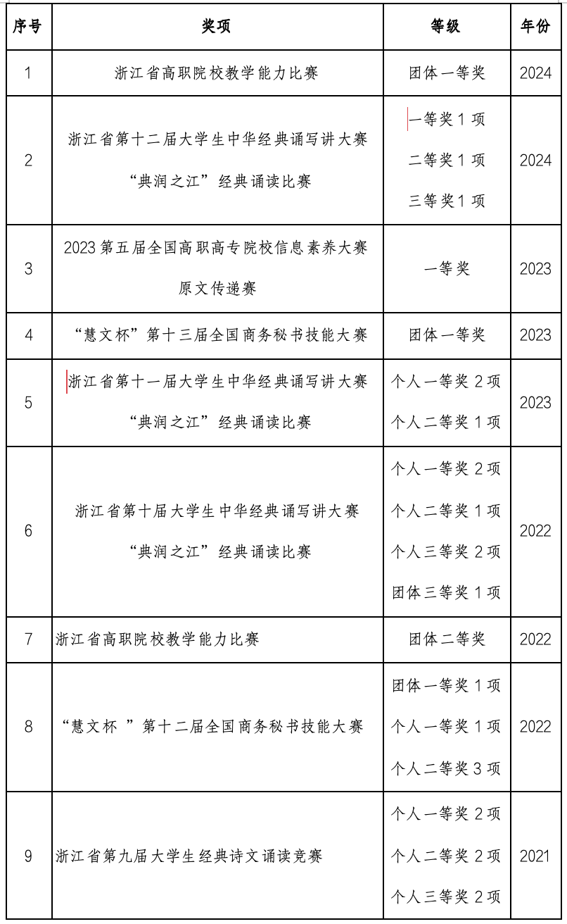 技能大赛是学生展示自我的平台,现代文秘专业以技能大赛为契机,促进教师队伍建设,以技能大赛为载体,促进学生全面发展,提高人才培养质量。2016年至2024年,专业师生积极参加全国和全省技能比赛,屡创佳绩,成绩斐然,获得三等及以上奖项70余项。