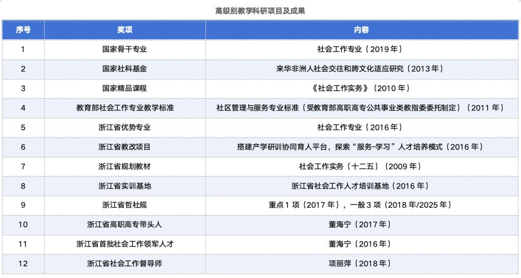 专业教师发起创立了义乌市同悦社会工作服务中心,2021年同悦社会工作服务中心政府采购服务资金达到480余万,聘用专职社工42名,在引领社会工作发展、创新社区治理中发挥了积极作用,得到央视、人民日报等媒体高度关注,接待了包括全国人大、外交部、国家民委等120余批次领导和考察团来访。