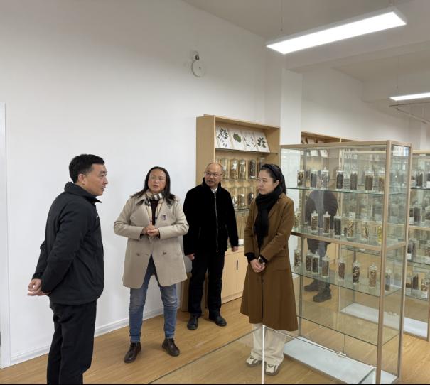 陆学胜一行先后实地察看了药用植物园、中药标本陈列室、模拟药品购销室等科普教育场馆,听取了学校药学科普教育阵地负责人高保英工作开展情况介绍。