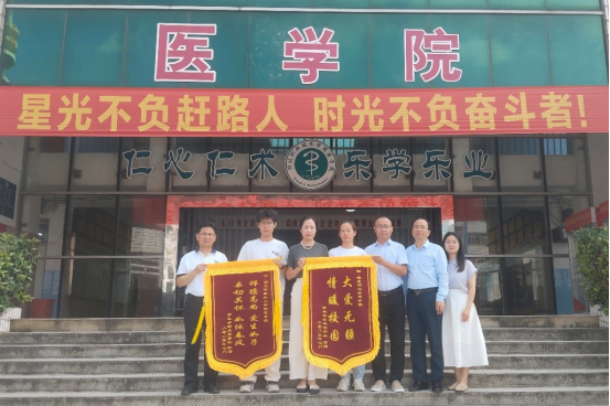 (本网讯 罗舒馨 邓彬新)7月7日,beat365亚洲体育官方网站beat365亚洲体育官方网站迎来了一位特殊的客人 ---2023 级临床医学专业小余同学的家长。她带着两面鲜红的锦旗,专程来到学校,向学校全体师生表达最诚挚的感激之情。