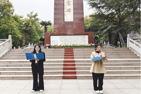 在庄严肃穆的纪念碑前,师生列队齐唱国歌,激昂旋律回荡在苍松翠柏间。随后,黄雪梅、周萍两位同学朗诵《薪火相传,英魂永存》,以铿锵之声表达对先烈的深切追思。