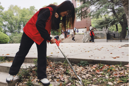 仪式结束后,同学们身穿志愿服务红马甲,化身为“清洁小卫士”,在纪念碑周边开展了卫生清扫工作。劳动的身影与鲜红的马甲交相辉映,成为纪念碑前一道靓丽的风景线,展现了新时代青年传承奉献精神的行动自觉。