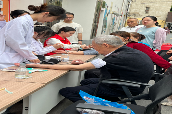 在另一侧的爱心义诊区,志愿者们为社区老年居民提供测量血压、健康咨询等基础服务,细致入微的服务让居民们倍感贴心。面对志愿者们的耐心讲解和专业操作,老年居民纷纷点赞,称这项服务既实用又暖心。
