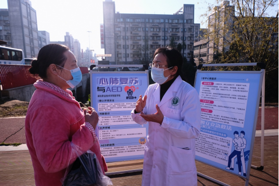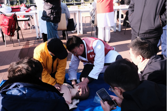 活动现场气氛热烈。王洪涛教授利用专业的CPR模型、AED训练机和海姆利克急救背心,为在场的环卫工人和消防员们系统讲解了急救心肺复苏(CPR)的操作流程、自动体外除颤器(AED)的使用方法以及针对气道异物梗阻的海姆利克急救法。